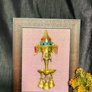 Brass Lord Ganesha with 3 Bells and Diya for 3 Wicks Brass Wall Hanging with frame