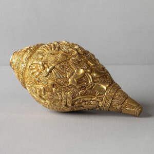 Design: Crafted with skilled hands, this brass conch shell shows Goddess Durga in full glory in her Adi Parashakti form. The figure has weapons in all hands and is seated on her vehicle, the lion, which stands for Dharma.