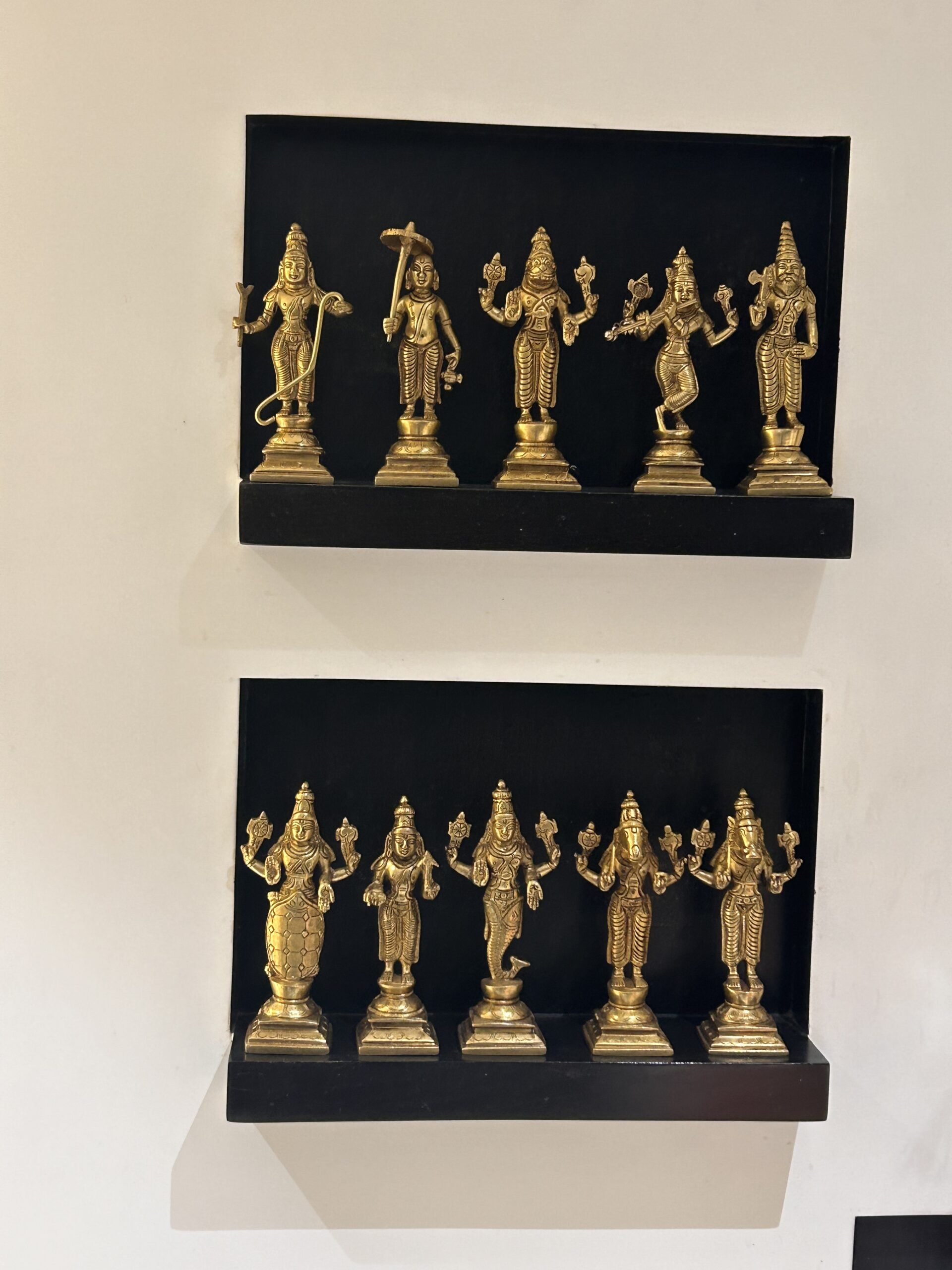 Beautiful brass deities of Dashavatara -Ten Incarnations of Lord Vishnu ( Matsya, Kurma, Varaha, Narasimha, Vamana, Parashurama, Rama, Balarama, Krishna and Kalki. Brass is the most popular metal for cast metal sculptures