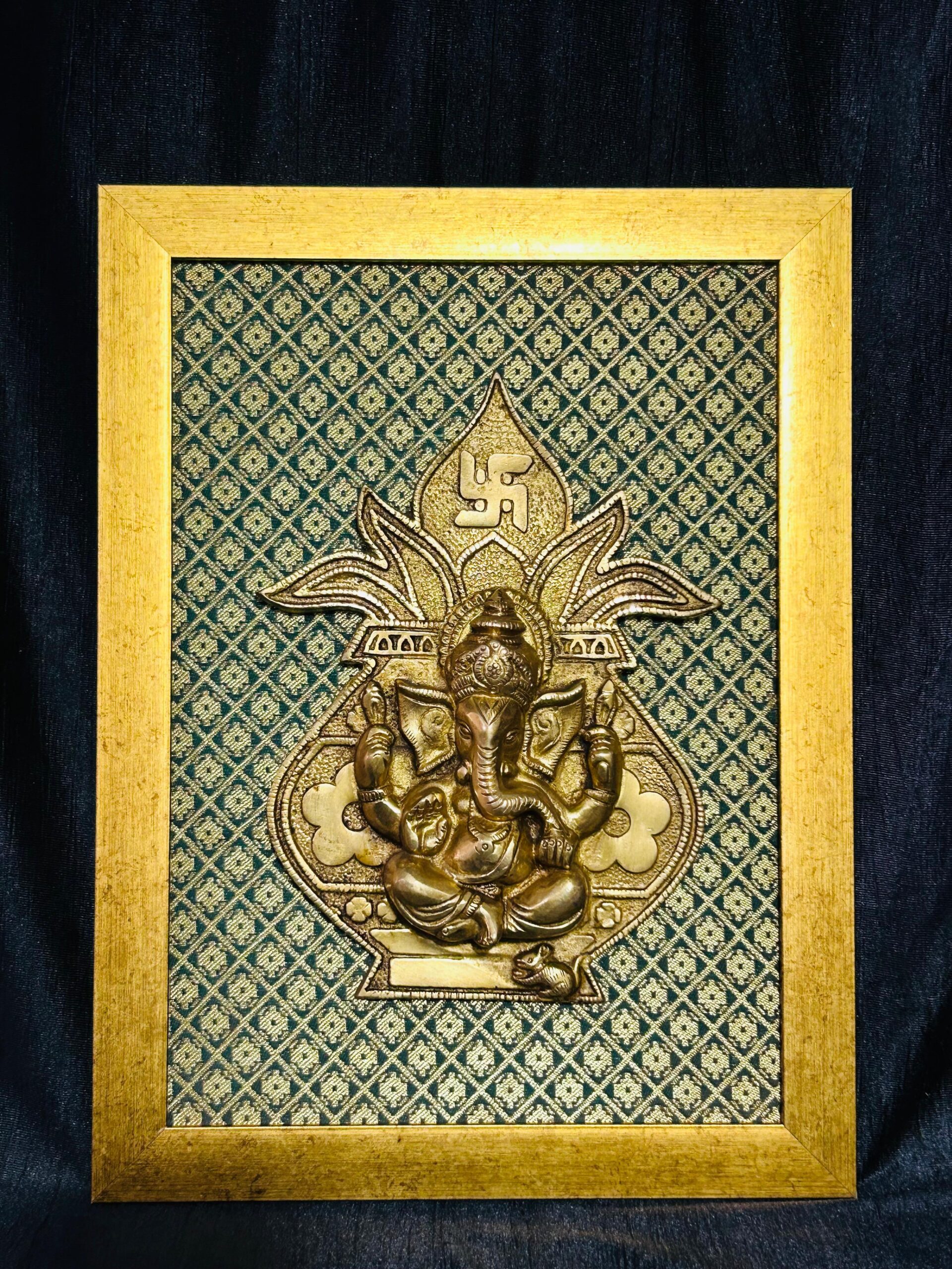 Brass Ganesha with Kalash and swastik Wall Hanging with frame 10 inch