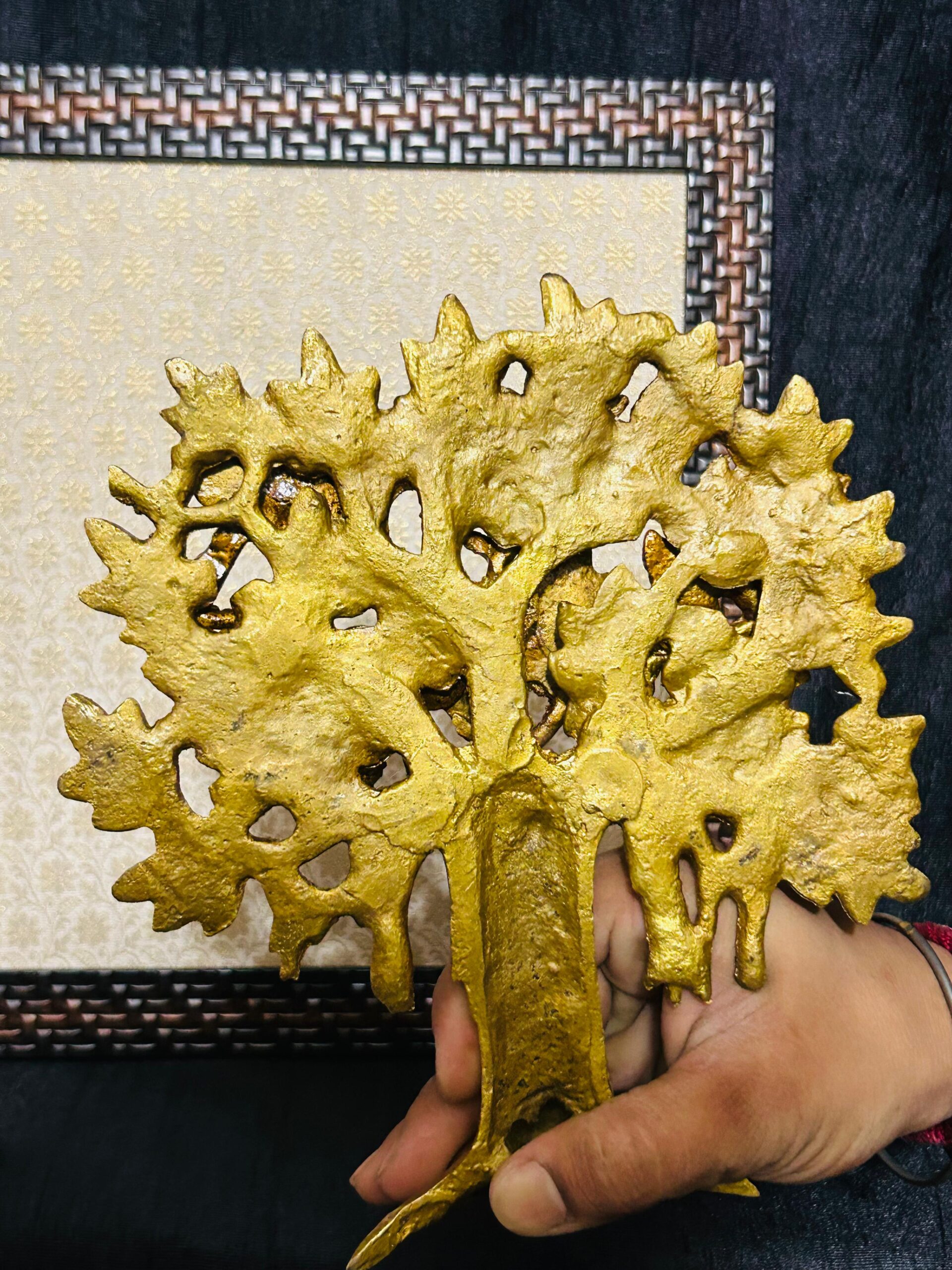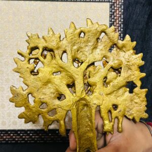 - The Framed Brass KALPAVIRUKSHA TREE On brocket cloth Wall Hanging by Indian Handicrafts is a stunning piece of brass wall decor. This exquisite wall hanging is made with premium quality raw brocket, offering a luxurious and elegant touch to any space. With its finely detailed brass idol, this product adds a divine and artistic element to your walls. Elevate your home decor with this unique and spiritually-inspired wall hanging.